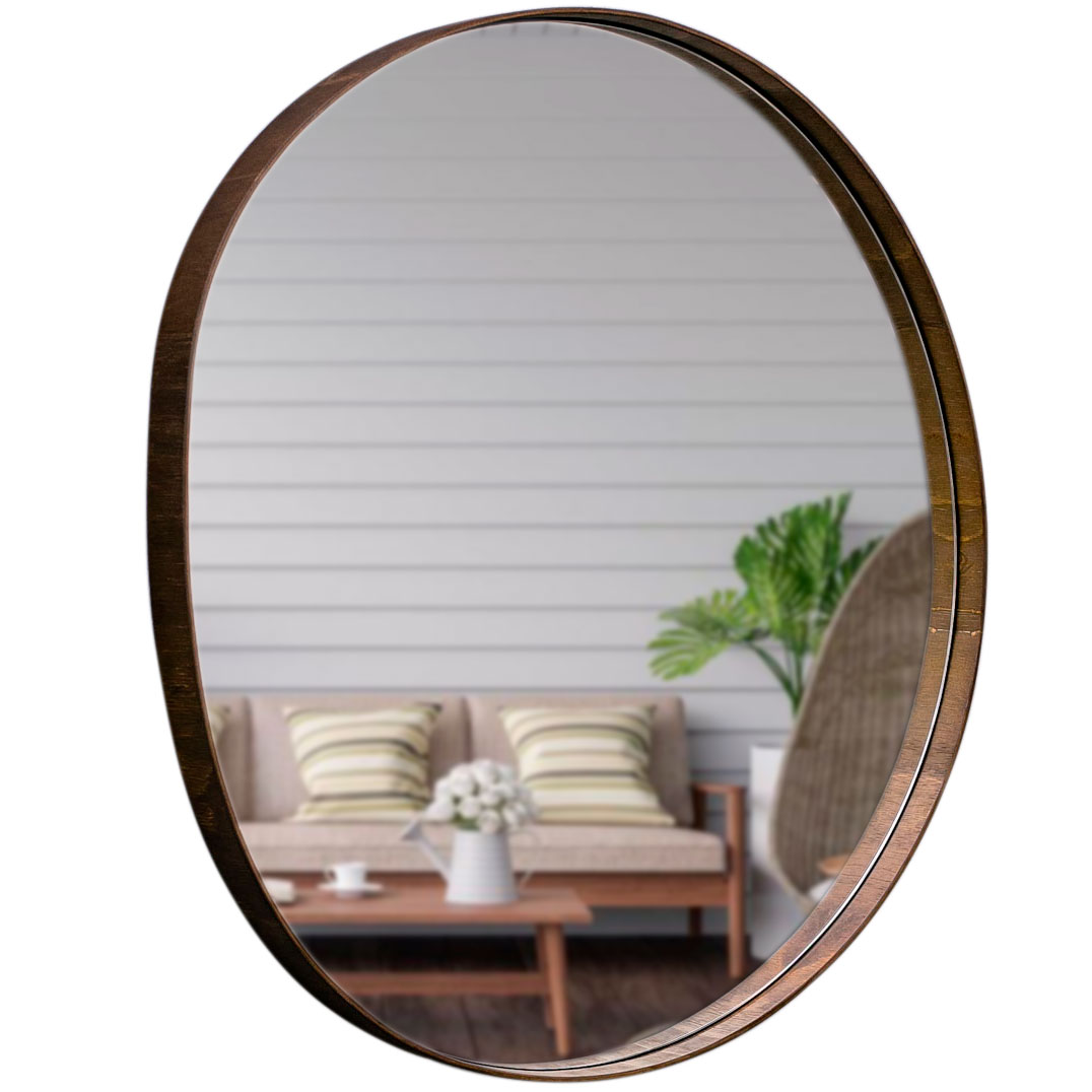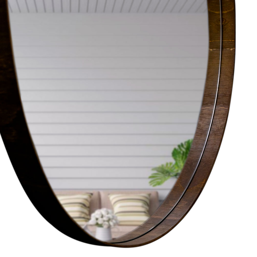 Espelho em formato Redondo com moldura de madeira na cor Imbuia. Fabricado a mão em um processo artesanal, trazendo diferencial e sofisticação em cada peça. Fabricamos em diversos tons de cor e em qualquer tamanho.