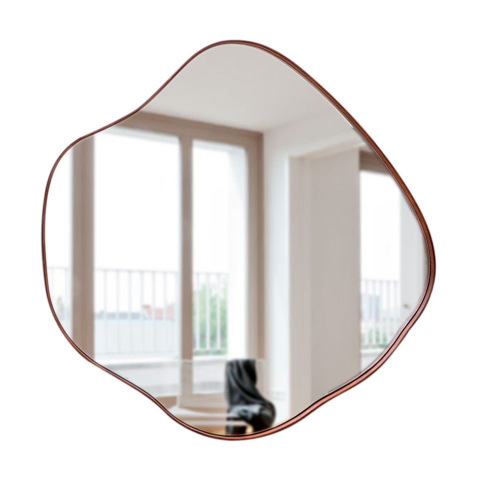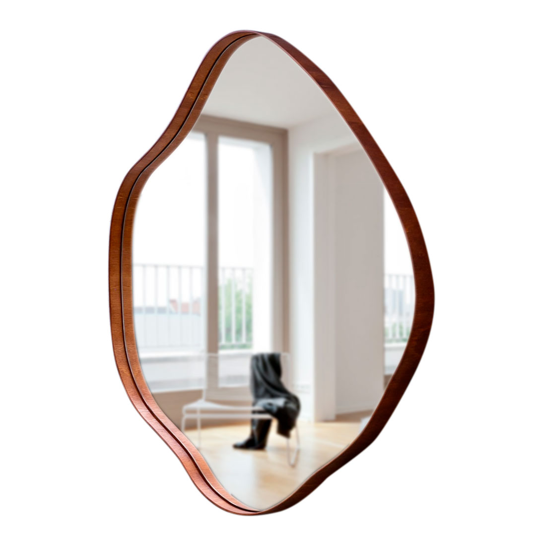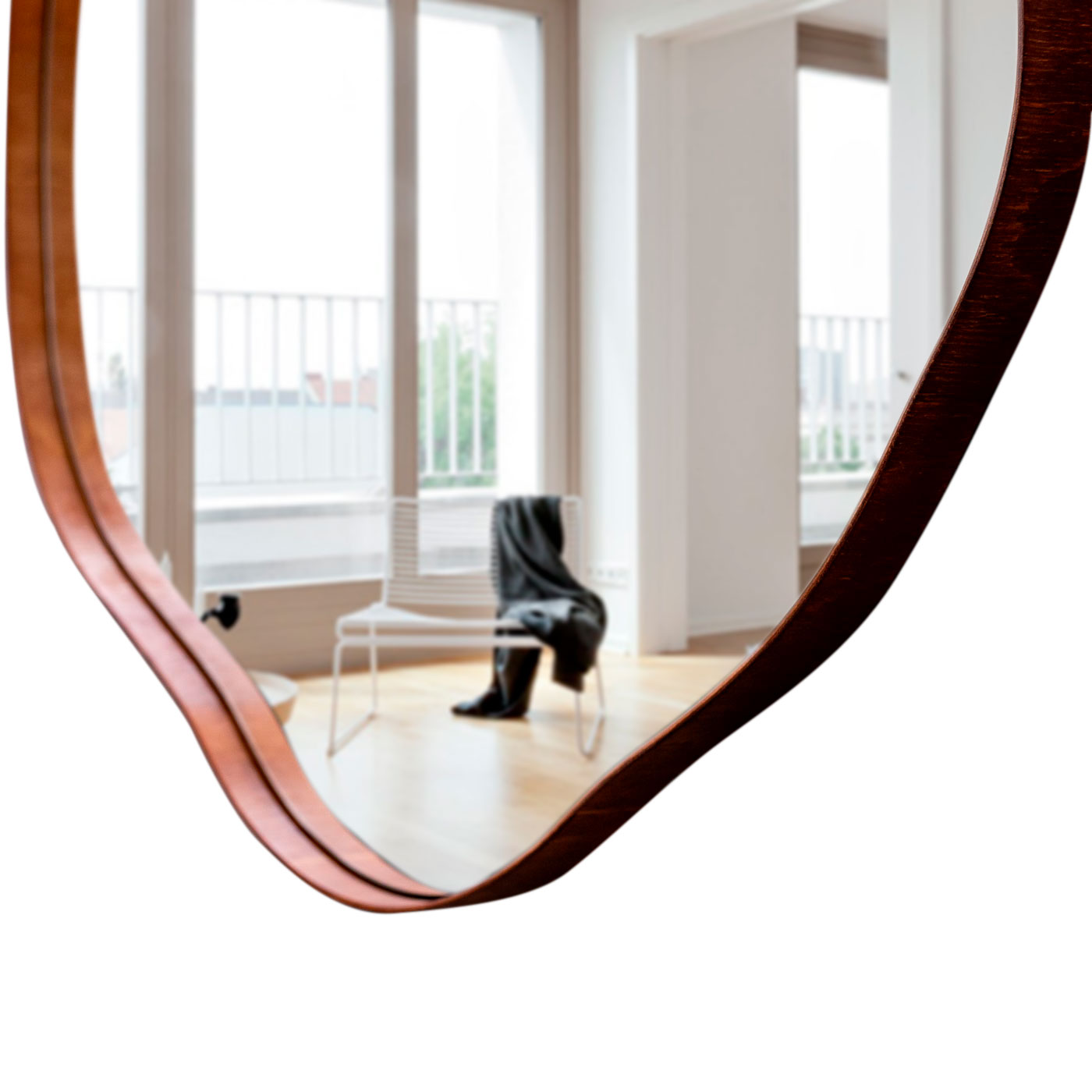 Espelho em formato Orgânico com moldura de madeira na cor Imbuia. Fabricado a mão em um processo artesanal, trazendo diferencial e sofisticação em cada peça. Fabricamos em diversos tons de cor e em qualquer tamanho.